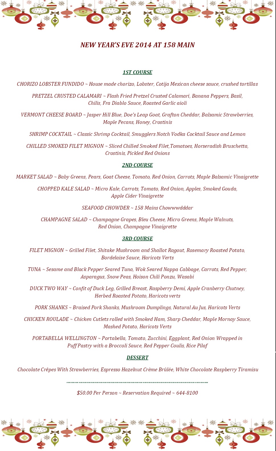 AnnouncementNew Year’s Eve 2014 Menu December 24, 2014 158 Main & JPD For last year’s words belong to last year’s language And next year’s words await another voice. And to make an end is to make a beginning. ~T.S. Eliot And without further ado, the menu… Don’t forget to make a reservation! 802-644-8100 Share this: Share on X (Opens in new window) X Share on Facebook (Opens in new window) Facebook Like Loading... Published by 158 Main & JPD View all posts by 158 Main & JPD