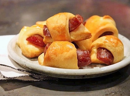 Canapé is the French word for a small, bite-size piece of bread or light pastry with a savory topping served at a cocktail party or on a buffet table. Canapé is also the name for a decorative sofa. Go figure. Which brings us to today’s National Food Holiday: It’s Pigs-in-a-Blanket Day. What’s the connection, you might ask? Well, according to food historians those cocktail sausages rolled in a crust are direct descendants of those fancy Canapés famously served during Victorian times. Now you might ask, what is the pig connection? To answer this, we turn to 1930 and the first American recipe for the appetizer in question, which describes oysters wrapped in bacon. So it would seem the pig was the blanket then, not the other way around. We rather like our bacon stacked between pancakes. And yes, that version of the well tucked in piggies is on our Breakfast Menu.